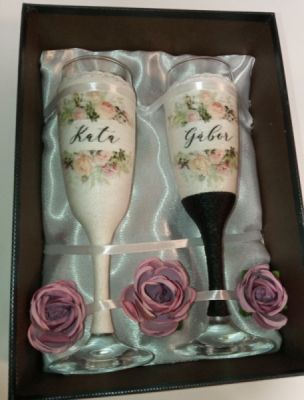 Egy vásárlói kérés inspirálta a díszdobozos megoldásokat: az általam készített üvegeket és poharakat elegáns ajándékdobozban szerették volna átadni az ifjú párnak.