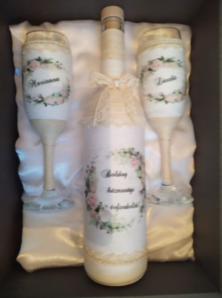 Az üvegekhez külön kérhető díszdoboz, amelyet mindig: az alkalomhoz, a szett színvilágához, és a termék stílusához igazítva választok ki.