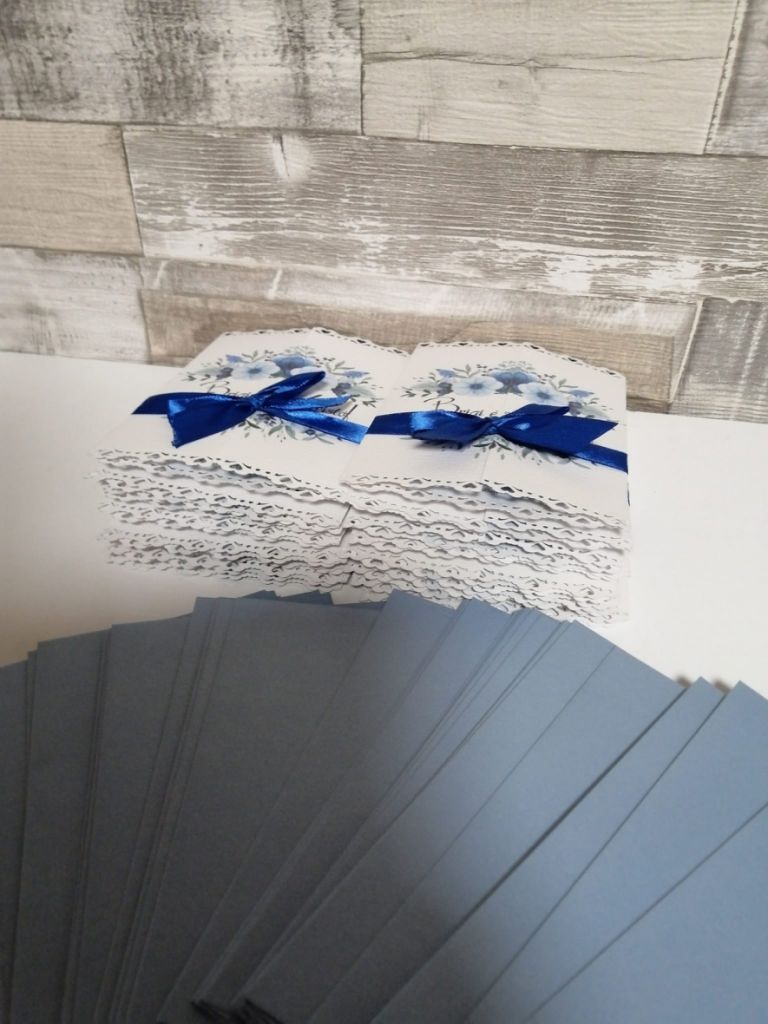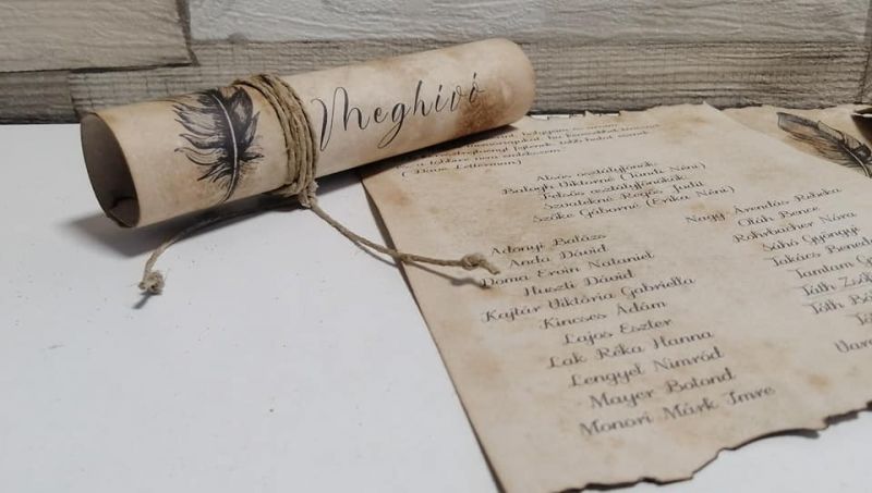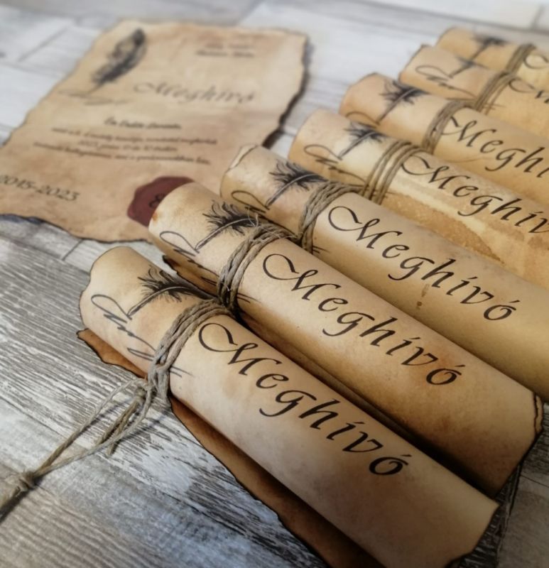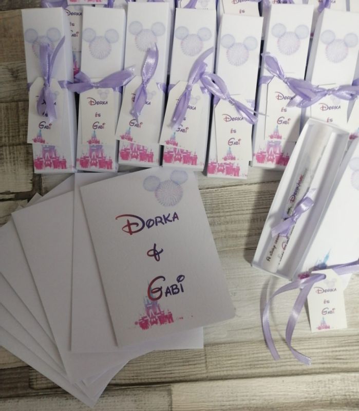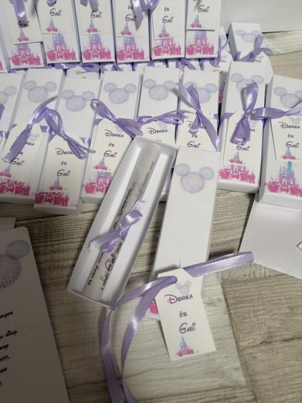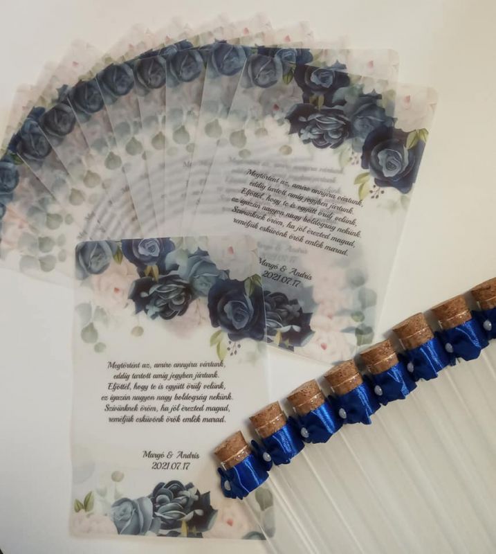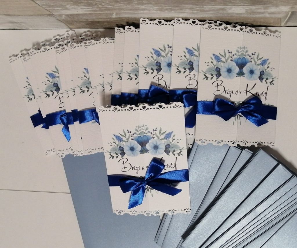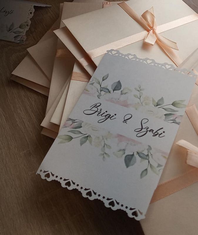 | Boríték – A meghívóhoz illő boríték, szalaggal átkötve (választható színben és mintával) |