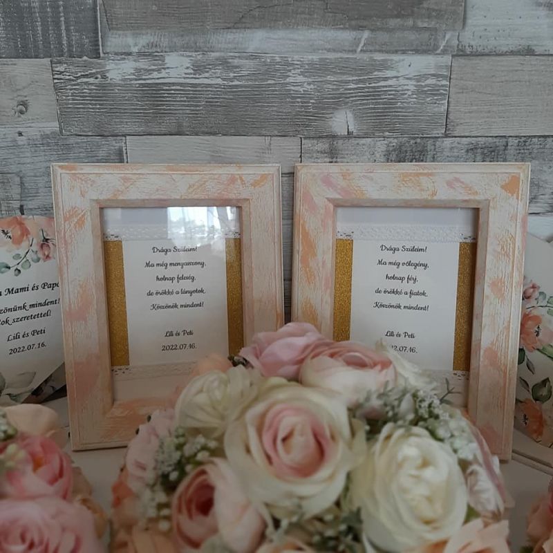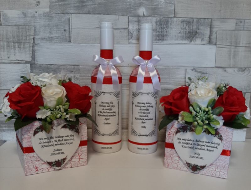 | Szülőköszöntő szett: 2 db elegáns zsinórozott díszüveg és 2 db virágbox, amelyek tökéletes köszönetajándékként szolgálnak a szülők számára. |