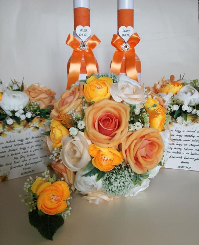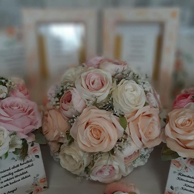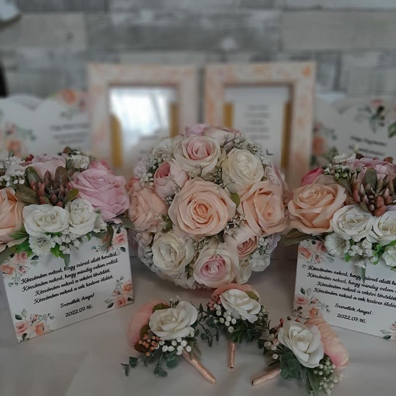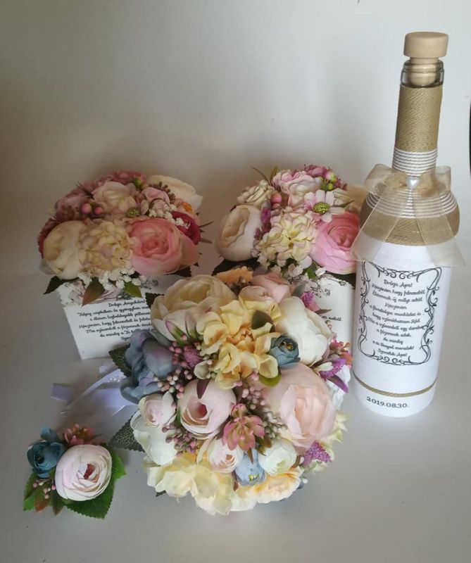 Harmónia: A szett minden eleme összhangban van egymással, a virágok, színek és stílusok úgy lettek összeválogatva, hogy tökéletesen illeszkedjenek esküvőd tematikájához.