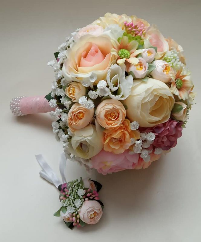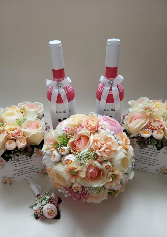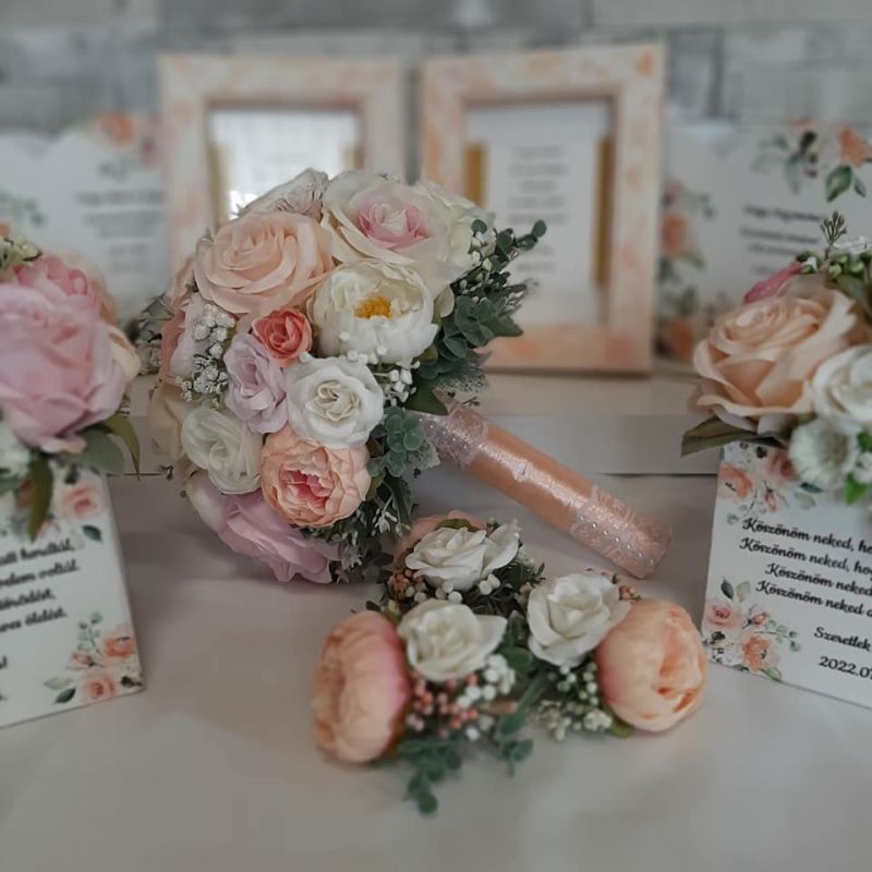 Virágok: Selyemvirágokból készült barack színű bazsarózsa, amely eleganciát és frissességet sugároz.