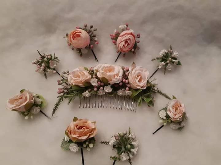 Felhasználás: A hajtűk és hajfésűk könnyen beilleszthetők a frizurába, és nemcsak a menyasszonyi hajhoz, hanem akár a koszorúslányoknak vagy a vendégeknek is elegáns kiegészítői lehetnek.